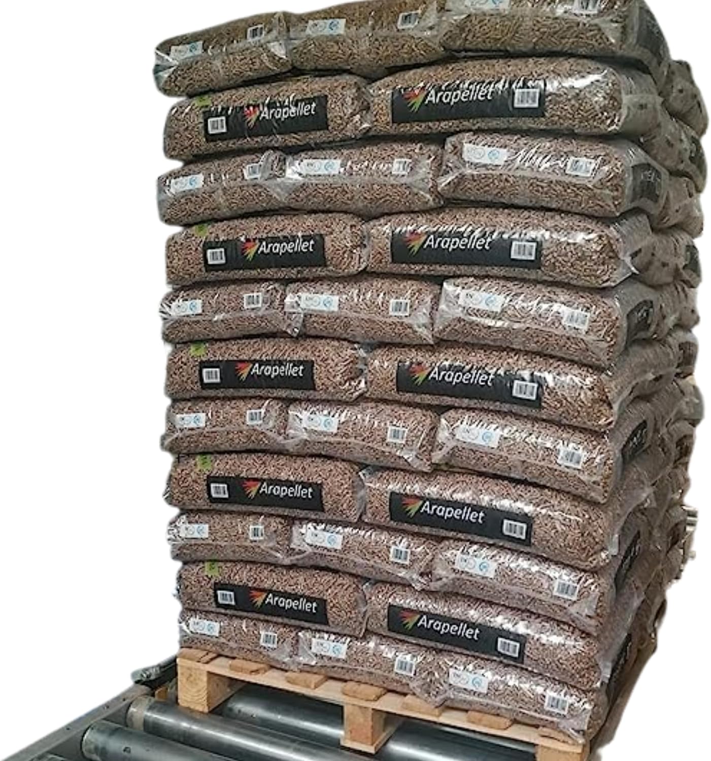 Cette palette de pellets Arapellet contient 70 sacs de 15 kg, soit un poids total de 1 050 kg. Ces pellets sont fabriqués à partir de bois recyclé et biomasse, certifiés ENplus A1 et DINplus, garantissant une combustion stable, efficace et respectueuse de l’environnement.