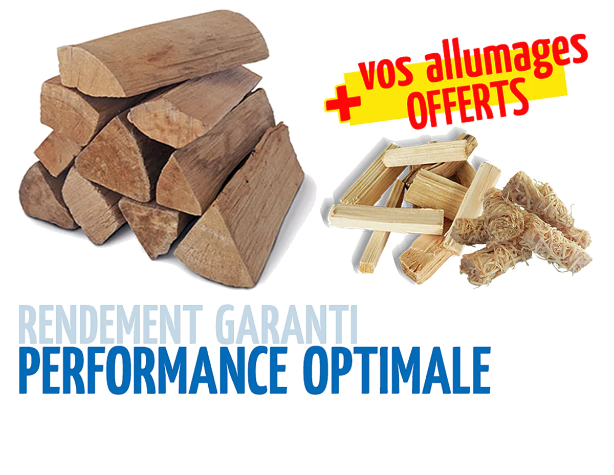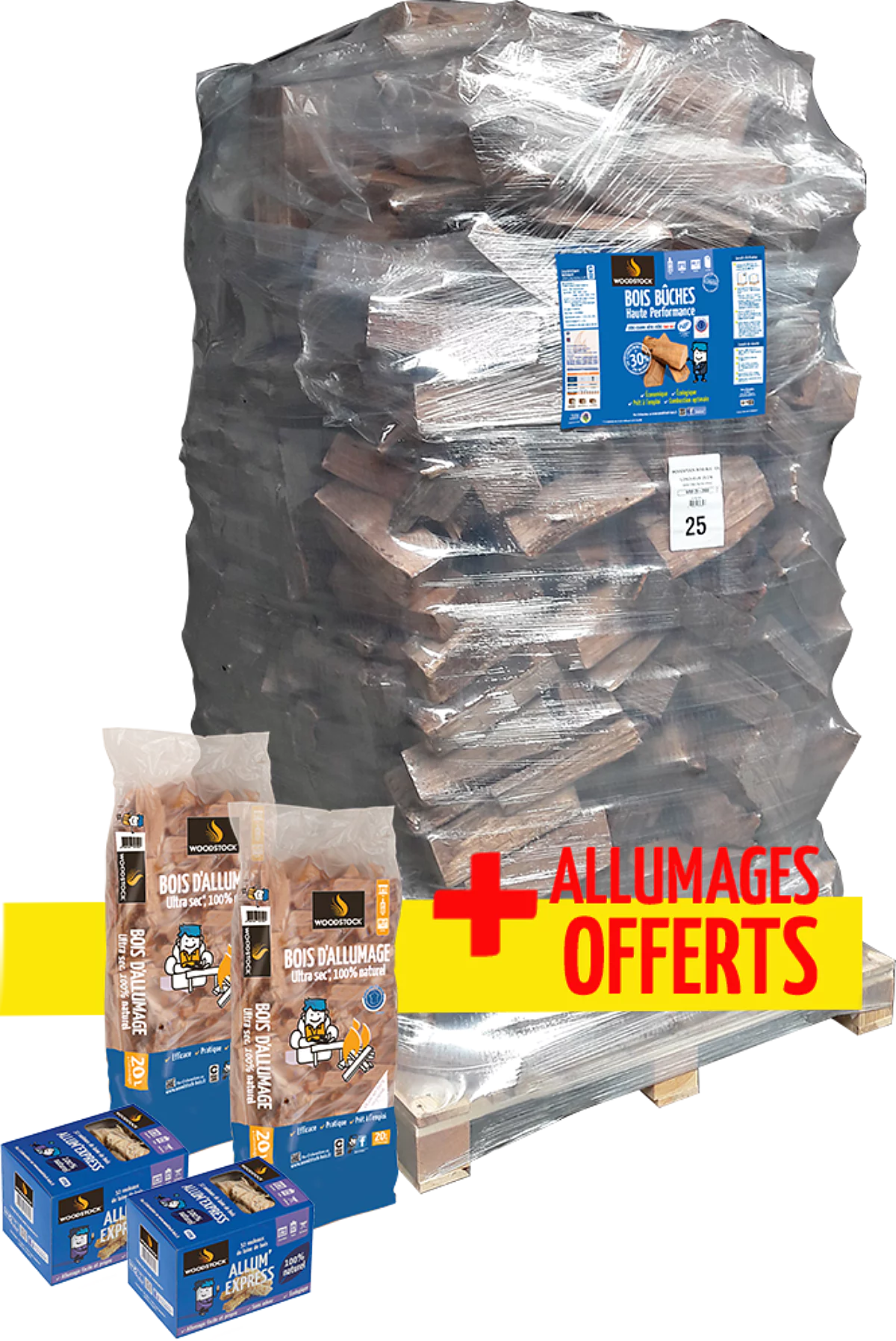 Conditionnées en ballot, les bûches sont prêtes à l’emploi et parfaitement adaptées aux poêles à bois, inserts et cheminées. Ce pack inclut également 2 sacs de 20 litres de bois d’allumage ainsi que 2 boîtes d’allume-feux WOODSTOCK Allum’Express OFFERTS.